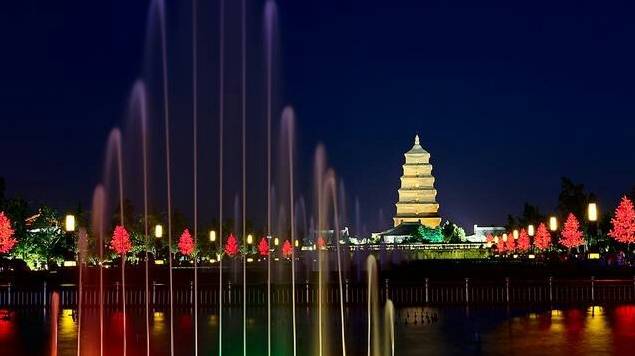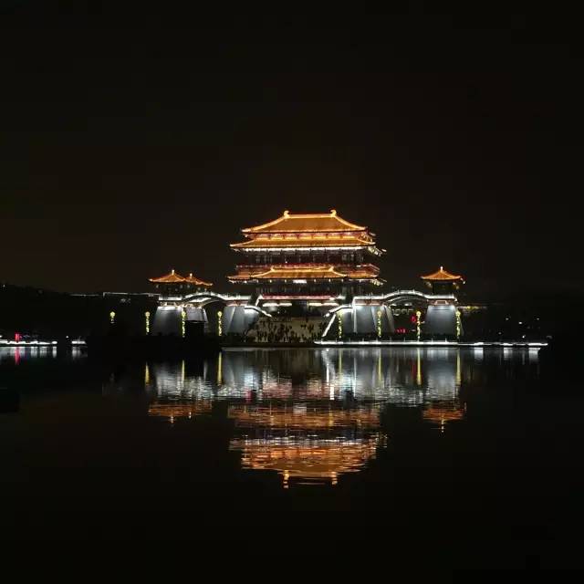 这里所有的建筑都是唐朝的。白天看有点像高仿的影视城,但夜晚所有灯光亮起就非常惊艳,仿佛真到了那个生气弥满、光彩熠熠的盛唐。